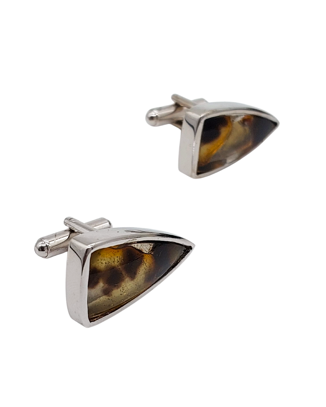 Abotoadura em prata com banho de ródio e lodonita em formato triangular. Um acessório marcante e contemporâneo, que destaca a beleza única da pedra com elegância e originalidade.