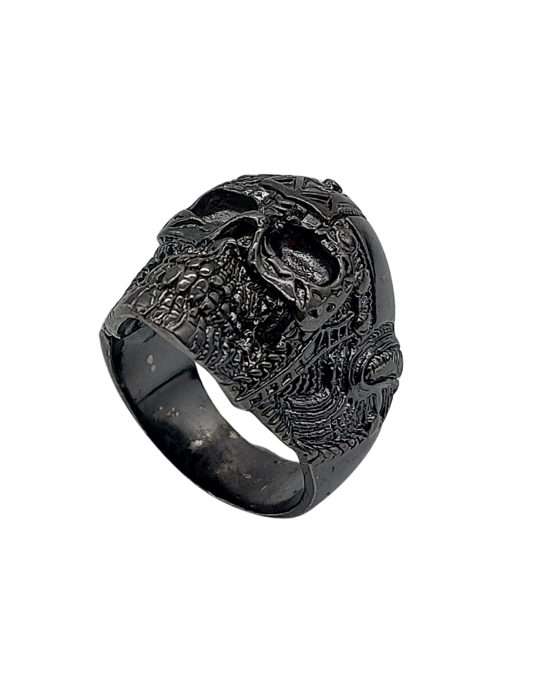Anel de prata 925 com banho de ouro negro, modelado em formato de caveira com detalhes em relevo. Uma peça robusta, cheia de personalidade e estilo para quem busca um acessório marcante.