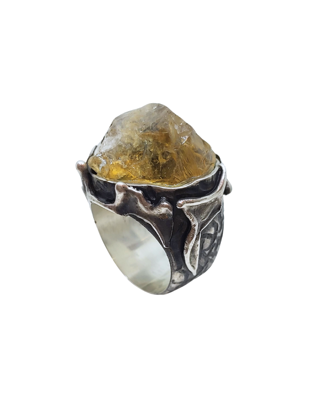 O contraste entre o acabamento rústico da prata e a pedra natural em seu estado mais orgânico cria uma joia autêntica, com personalidade e estilo marcante. Ideal para quem valoriza o artesanal e o poder das formas naturais.