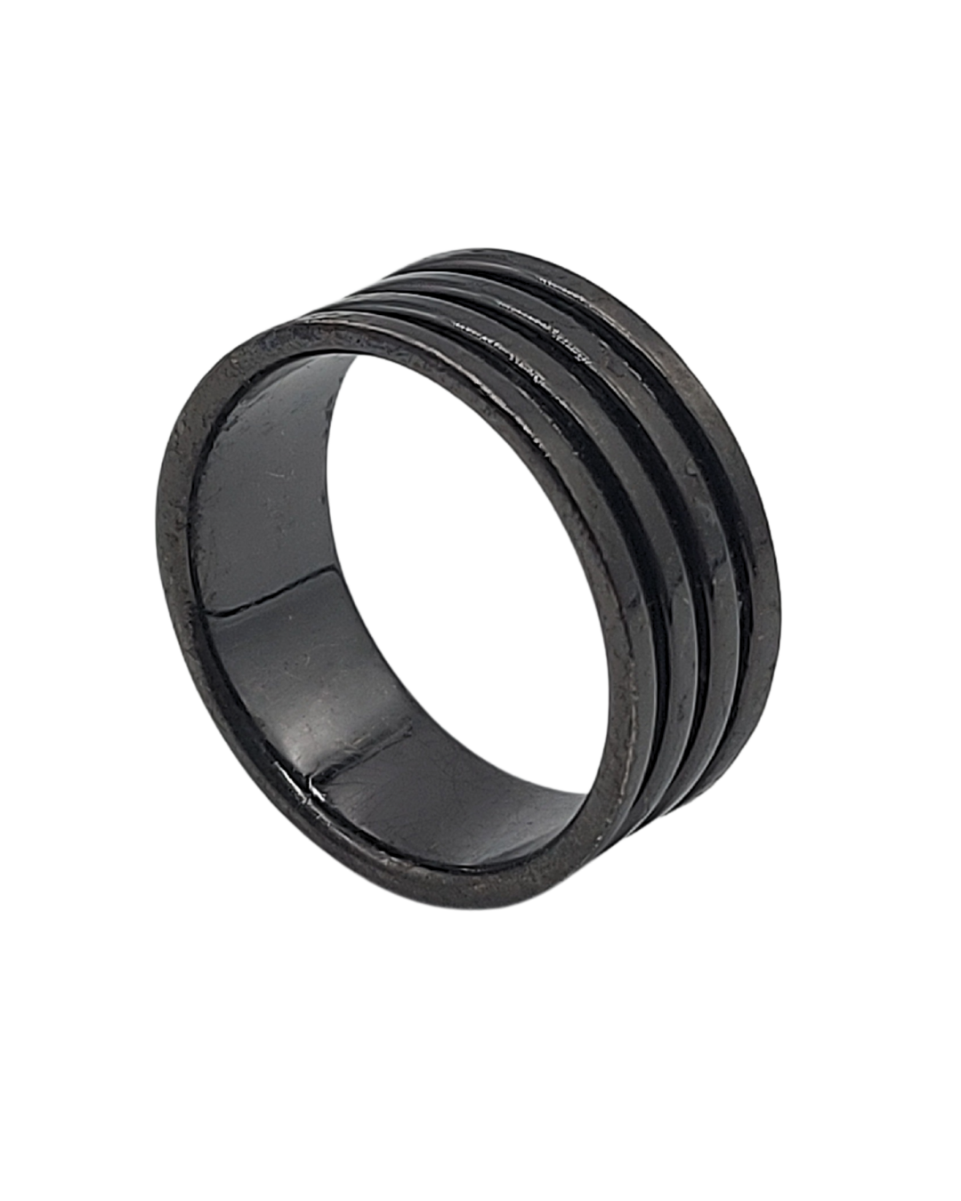 Anel masculino em prata 925 com banho de ouro negro e três frisos em baixo-relevo. Com visual moderno e acabamento sofisticado, é a escolha perfeita para quem busca uma joia de presença, com estilo urbano e atitude.