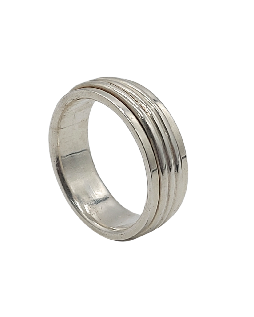 Anel em prata 925 com acabamento polido e detalhe de três linhas em relevo. Um design moderno e versátil, ideal para quem busca estilo com discrição.