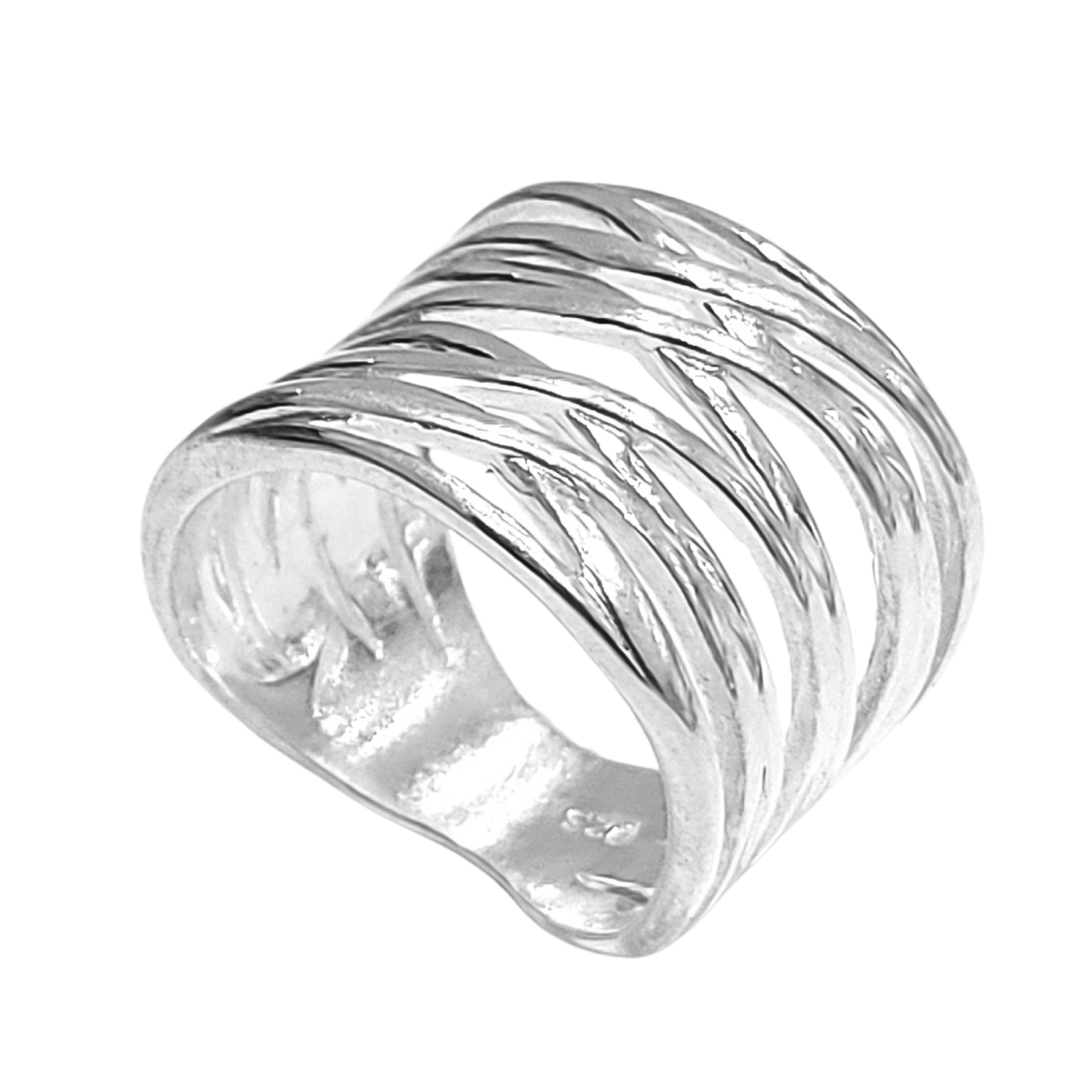 Anel em prata 925 com design contemporâneo e marcante, formado por linhas orgânicas entrelaçadas que criam um efeito de movimento e textura. A peça possui presença e leveza ao mesmo tempo, trazendo um visual moderno e sofisticado, ideal para compor produções elegantes ou dar destaque ao look no dia a dia.