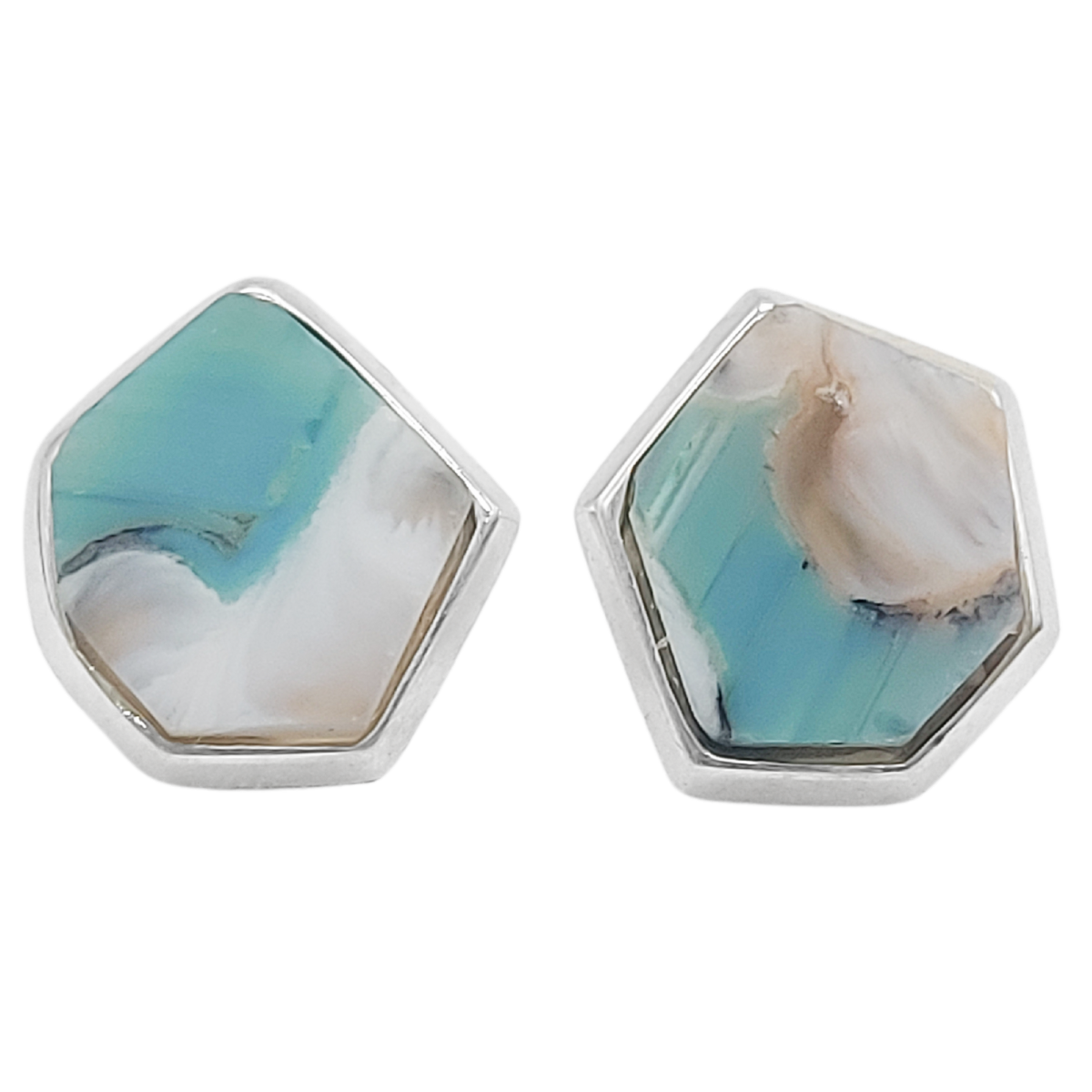 Esse brinco é um modelo de prata 925 com design geométrico em formato de pentágono desforme. Ele apresenta uma pedra natural com tonalidades que mesclam azul, branco e nuances terrosas, criando um efeito único e orgânico. A moldura em prata realça a pedra e dá um acabamento sofisticado. O brinco tem um estilo moderno e artesanal, ideal para quem busca joias diferenciadas e com personalidade.