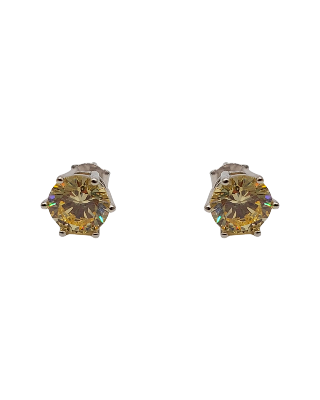 Brinco clássico em prata com banho de ouro branco, composto por uma zircônia amarela de 8mm que se destaca pelo brilho intenso e pela tonalidade sofisticada. A lapidação é valorizada pela cravação em 6 garras, garantindo segurança e máxima entrada de luz — uma peça elegante e atemporal, perfeita para iluminar qualquer produção.