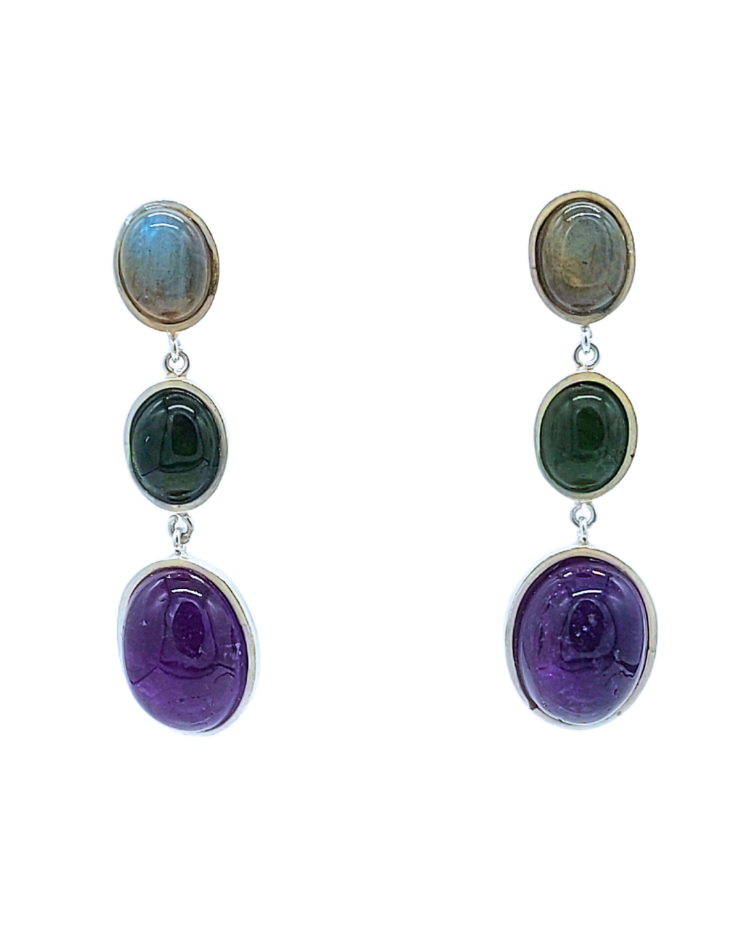 Encante-se com a sofisticação deste brinco em prata 925, composto por três pedras naturais deslumbrantes. A combinação da misteriosa labradorita, do vibrante quartzo verde e da elegante ametista cria uma joia única, repleta de personalidade.