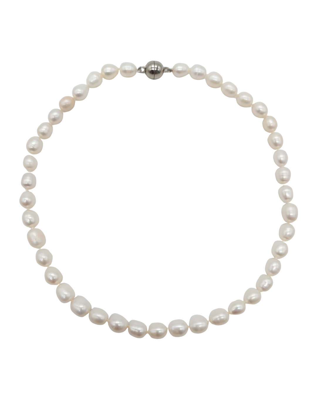 Um colar clássico de pérolas brancas naturais, montado com contas levemente irregulares que ressaltam seu charme orgânico. Ele é finalizado com um fecho de ímã banhado em ouro branco, que traz praticidade e um toque moderno ao design tradicional.