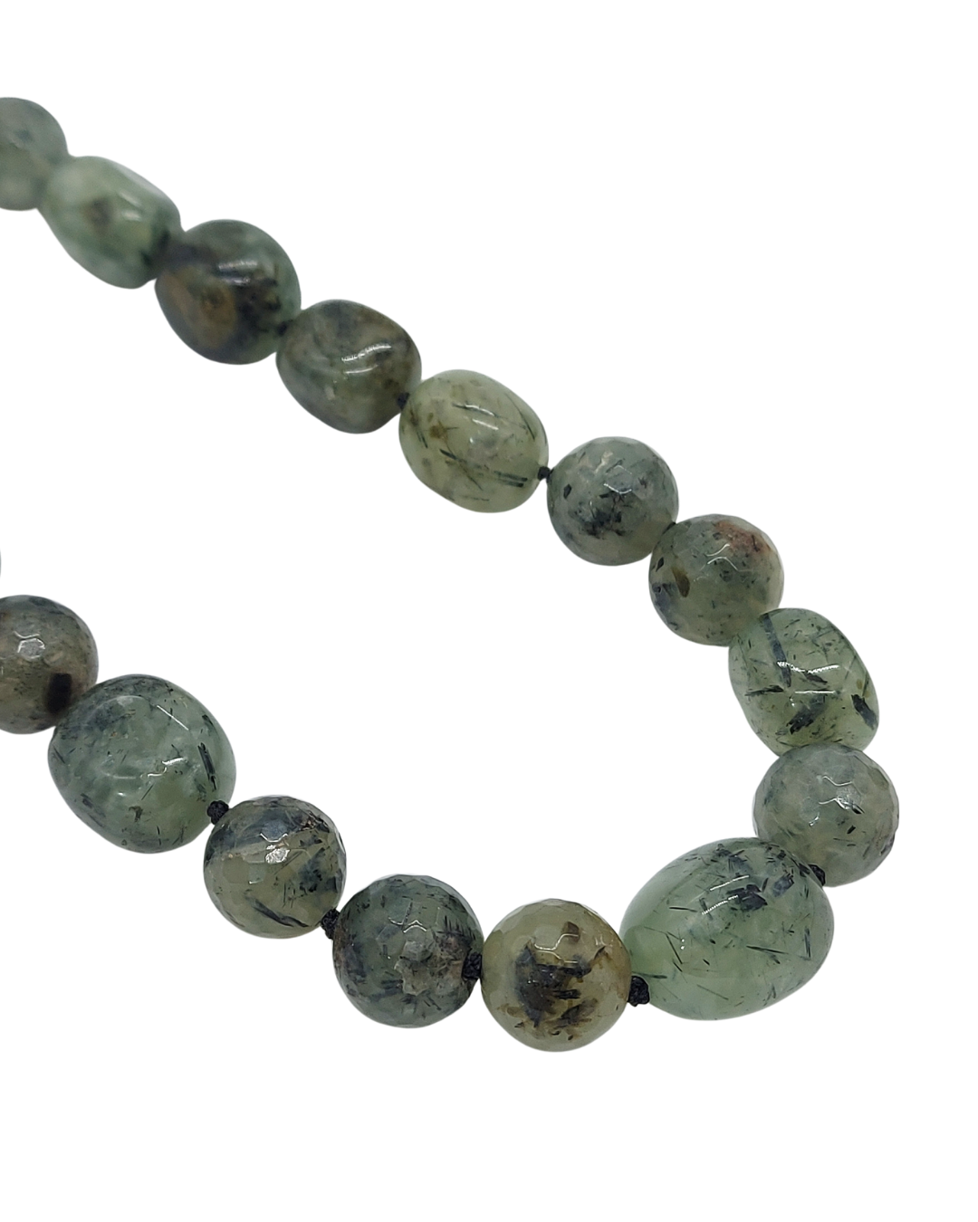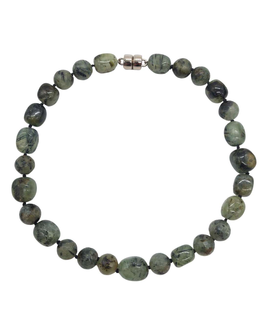 Colar de prenita natural com 46 cm de comprimento e fecho de ímã. As gemas em tons de verde suave possuem inclusões escuras características da pedra, tornando cada colar único e elegante. Uma joia autêntica e versátil em design artesanal.