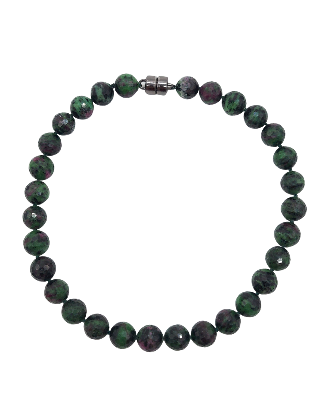 Colar de 45 cm confeccionado com contas facetadas de zoisita natural, exibindo tons intensos de verde com variações escuras características da pedra. As esferas lapidadas oferecem brilho discreto e elegante, enquanto o fecho de ímã garante praticidade e segurança. Uma peça marcante e versátil para compor diferentes estilos.