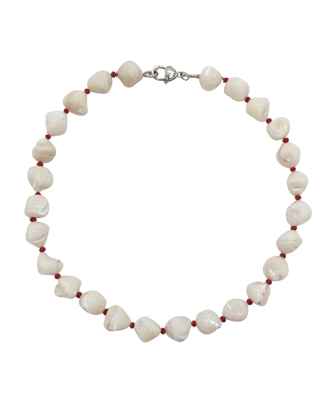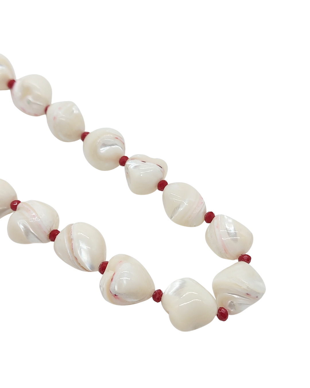Um colar de madrepérola com contas irregulares em tom perolado, intercaladas por pequenos cristais vermelhos, finalizado com um fecho lagosta banhado em ouro branco, que traz um toque moderno e delicado à peça.