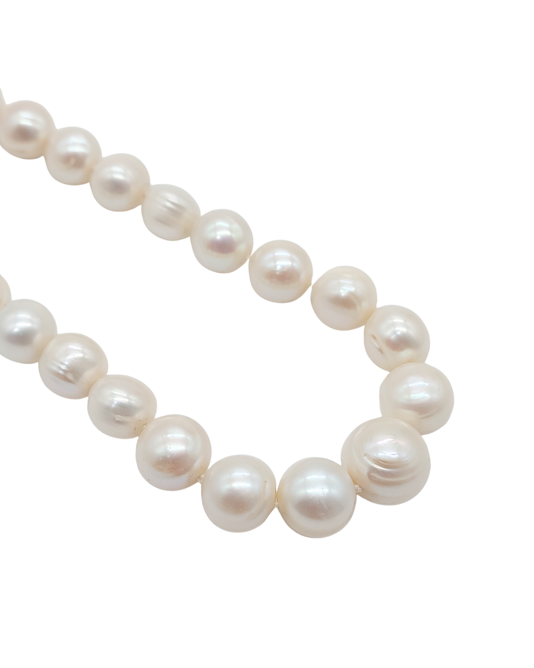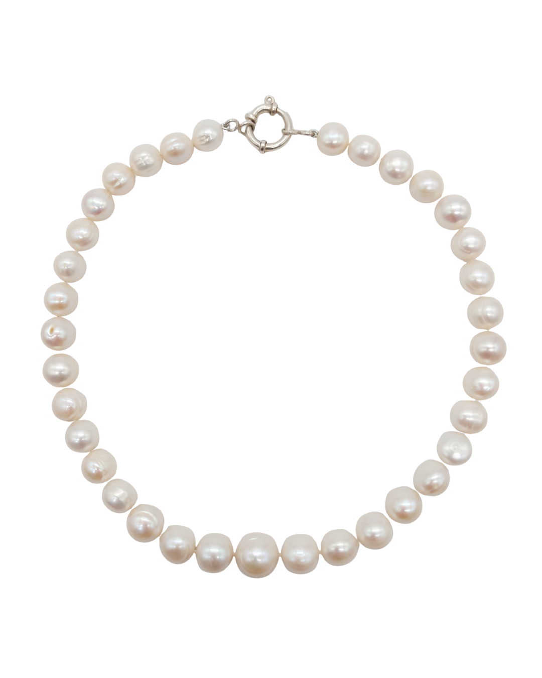 É um colar de pérolas barrocas brancas, com contas orgânicas e irregulares que dão um charme natural à peça. O fecho boia é feito em prata, e adiciona um toque moderno e elegante ao design clássico das pérolas. Uma peça delicada, atemporal e super versátil.