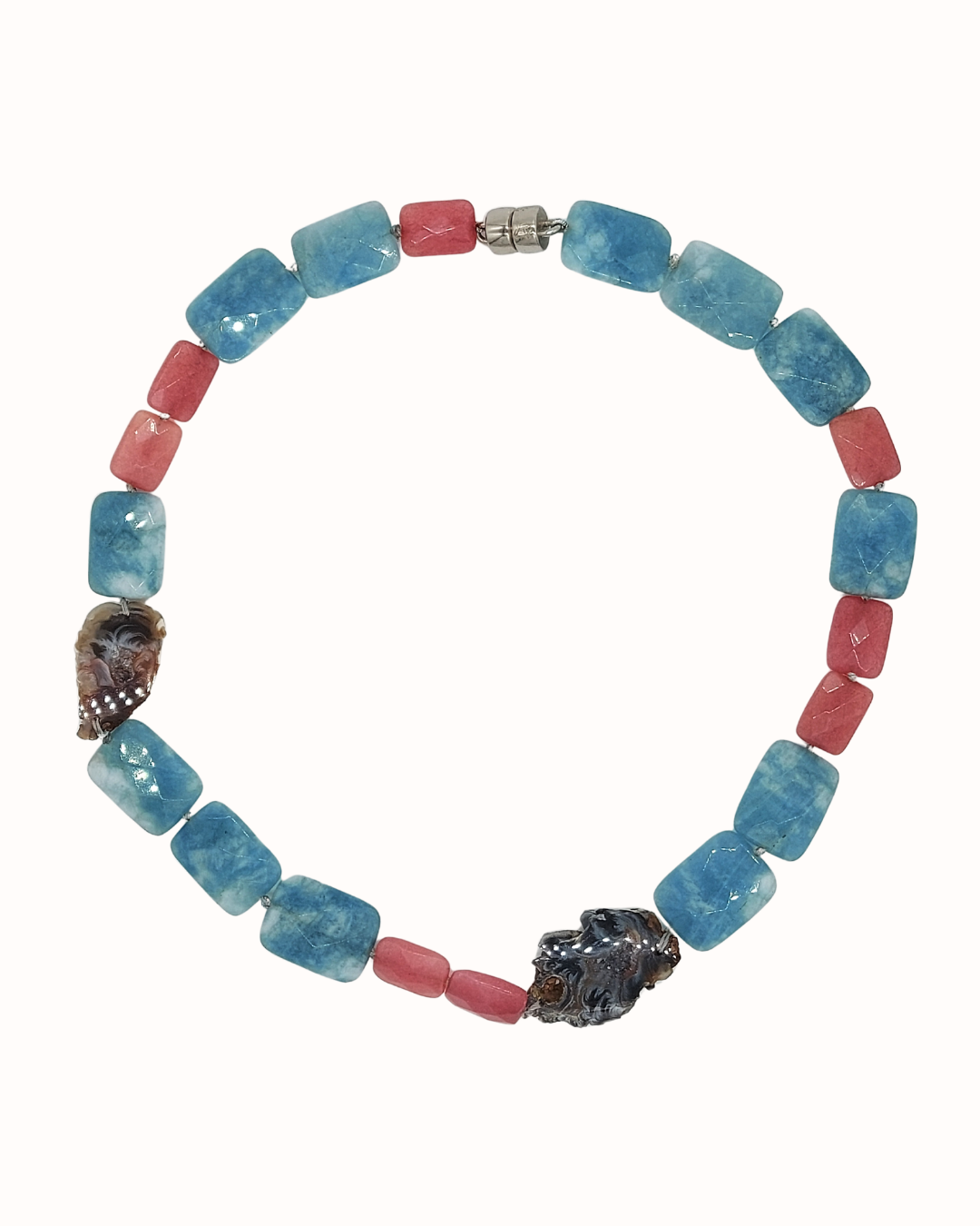 Este colar de 56cm combina pedras naturais de calcedônia azul em formato retangular, jade rosa e detalhes únicos em ágata esculpida. Feito com fecho de ímã prático e seguro, é uma peça vibrante e contemporânea — perfeita para quem valoriza estilo, cor e facilidade no uso.