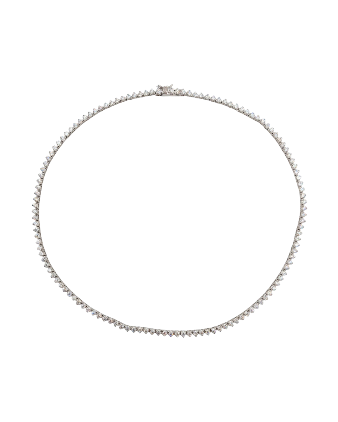 Colar riviera de 42cm em prata 925 com banho em ouro branco, cravado com moissanites de 2,5mm em montagem de 3 garras. Um design clássico com brilho intenso, perfeito para compor produções elegantes e atemporais.