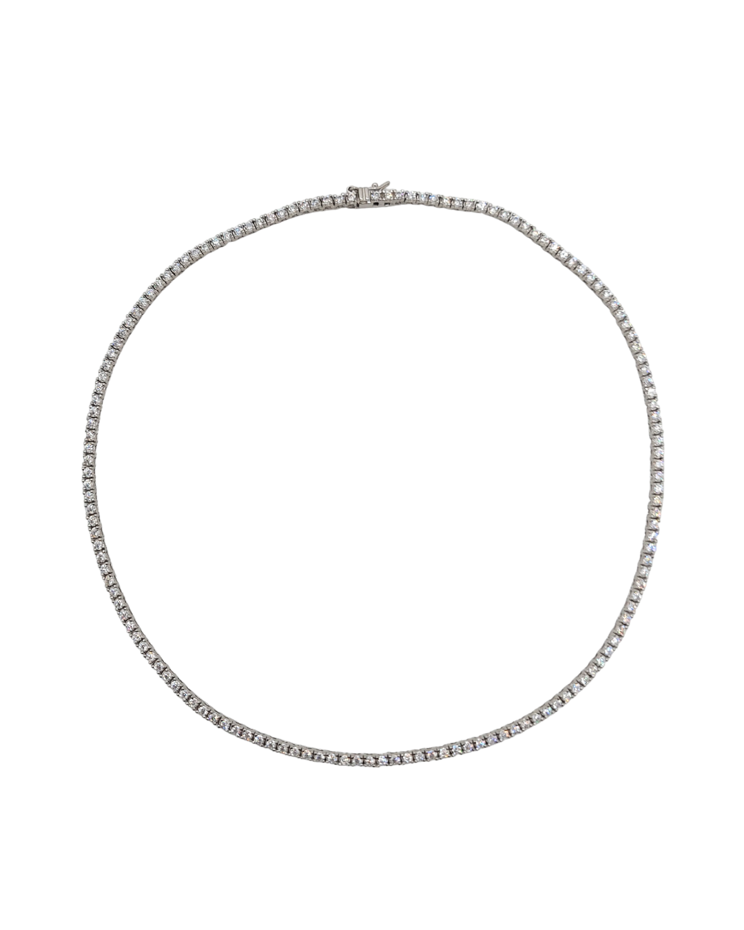 Colar curto estilo riviera em prata com banho de ouro branco, formado por uma sequência de zircônias lapidadas que proporcionam brilho sofisticado e uniforme.
