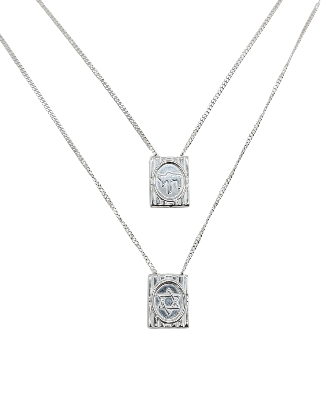 Escapulário judaico em prata, composto por duas plaquinhas retangulares: uma com a Estrela de Davi e outra com a palavra em hebraico Chai, ligadas por corrente delicada.