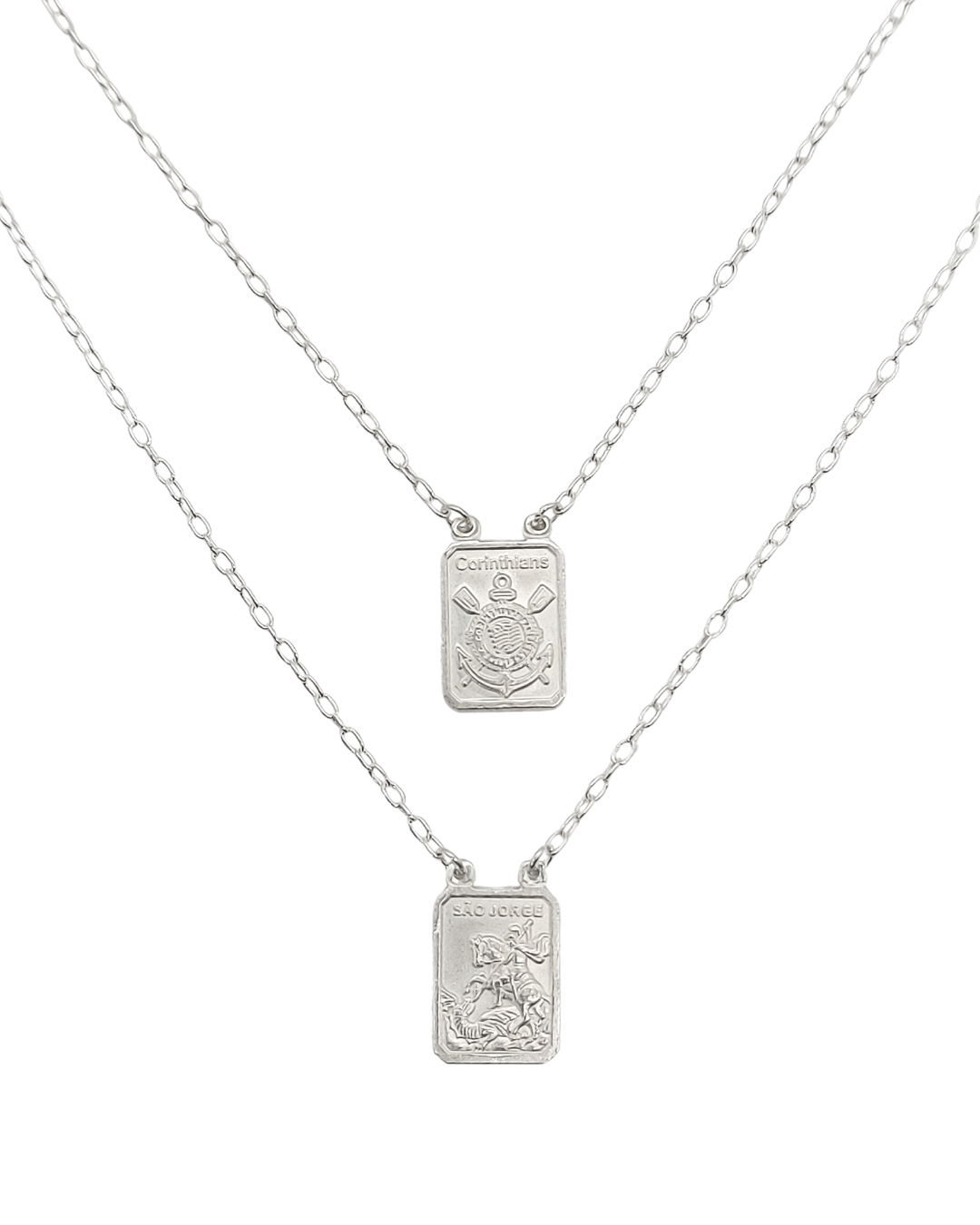 Escapulário em prata 925 com duas medalhas retangulares: uma com a imagem de São Jorge em alto-relevo e outra com o símbolo do Corinthians. As medalhas têm acabamento detalhado e ficam unidas por uma corrente fina e resistente, criando uma joia leve, moderna e perfeita para quem deseja unir fé e paixão pelo time.