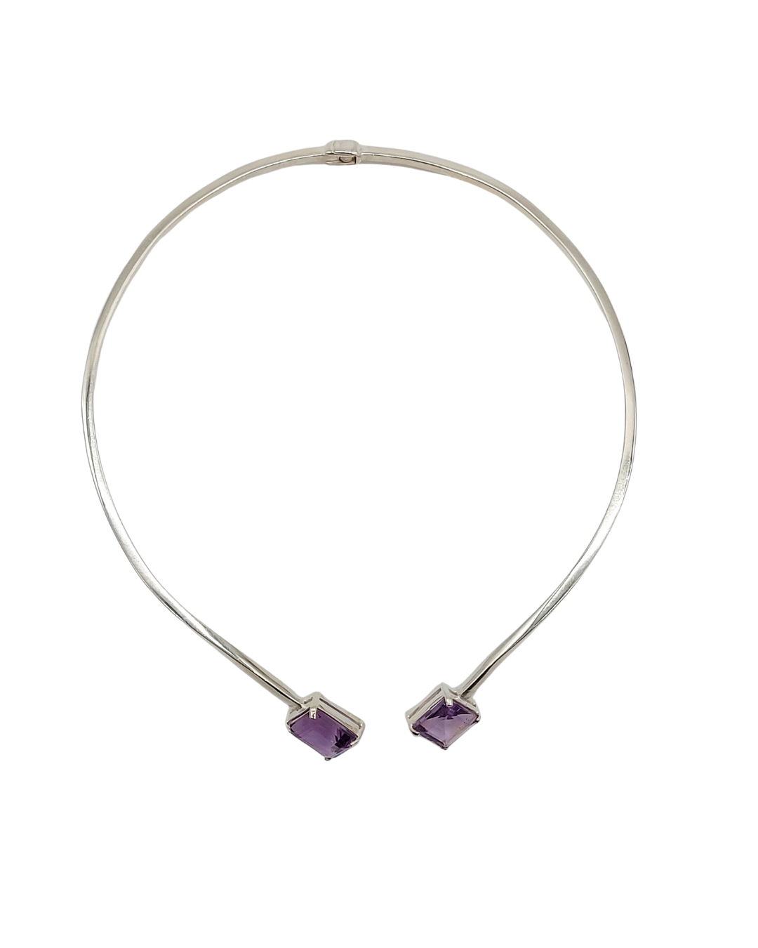 Gargantilha em prata 925 com design minimalista e moderno, composta por aro rígido levemente ajustável. As extremidades são adornadas com ametistas lapidadas em formato retangular, realçando o contraste elegante entre o brilho prateado do metal e o tom violeta das pedras.