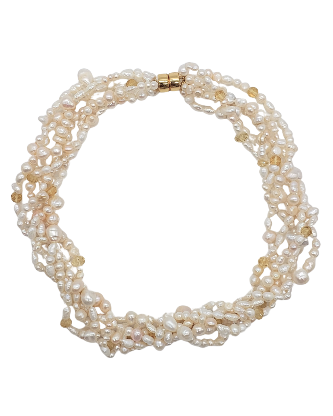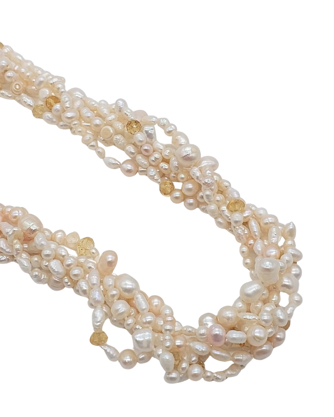 Colar de 50 cm composto por múltiplos fios de pérolas, com detalhes em citrino que adicionam pontos de cor e luminosidade à peça. Possui fecho de ímã banhado a ouro amarelo, garantindo praticidade e um acabamento sofisticado. Uma joia elegante e marcante, ideal para composições refinadas.