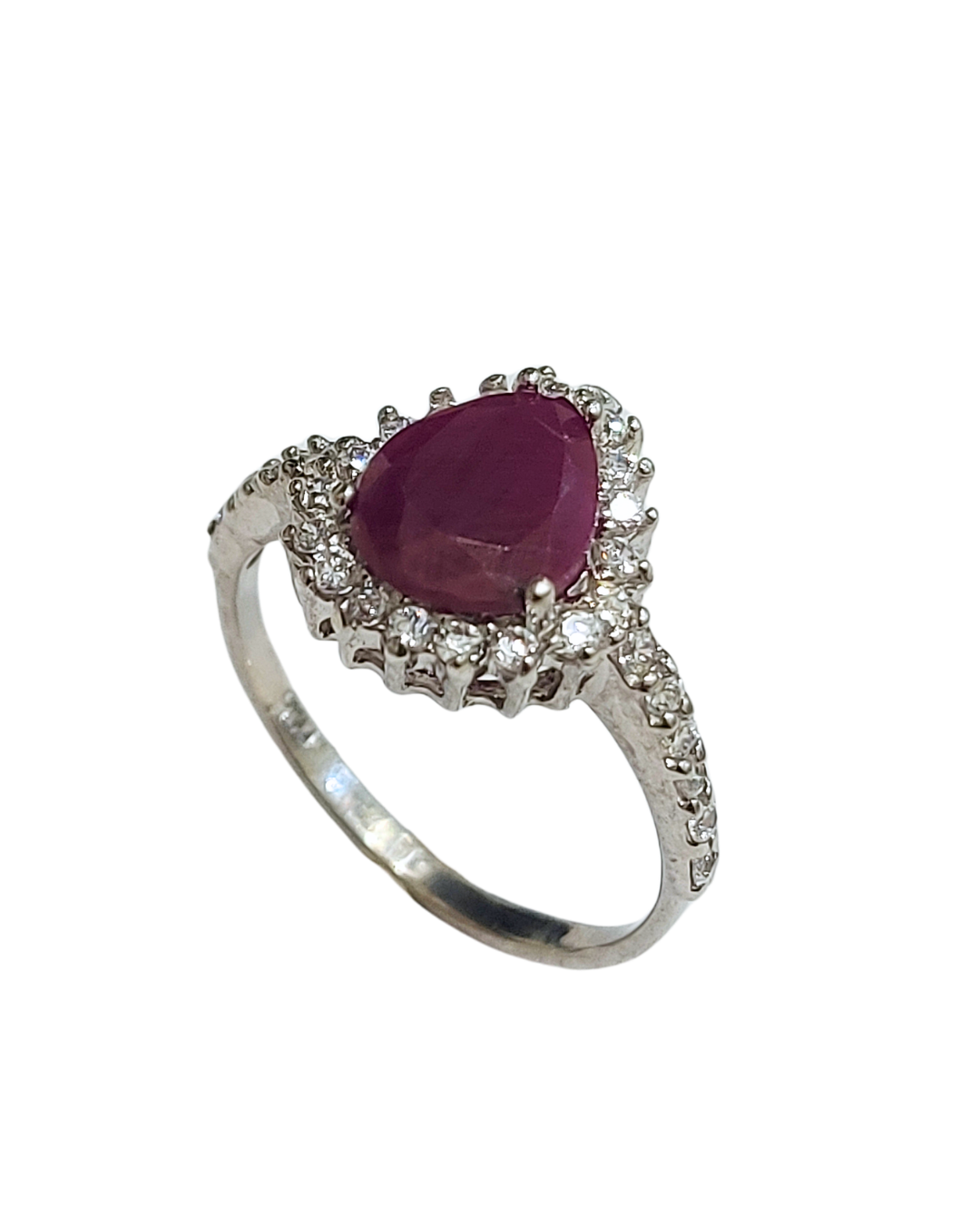Anel em prata 925 com banho de ouro branco, elegante e delicado. No centro, um rubi em formato de gota se destaca pela cor intensa e sofisticada, envolvido por um halo de zircônias que realçam ainda mais o brilho da peça.