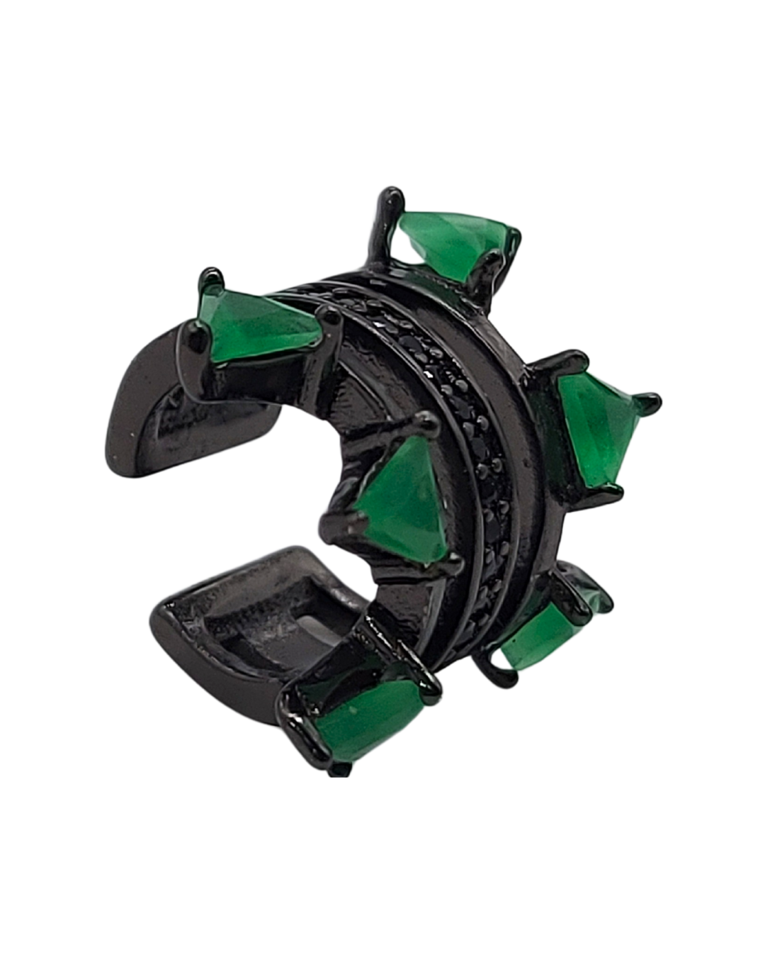 Piercing de gancho em prata com banho de ouro negro, realçado por zircônias verdes em lapidação triangular que conferem um visual ousado e sofisticado. O design moderno e marcante combina estilo e atitude, ideal para compor looks cheios de personalidade.