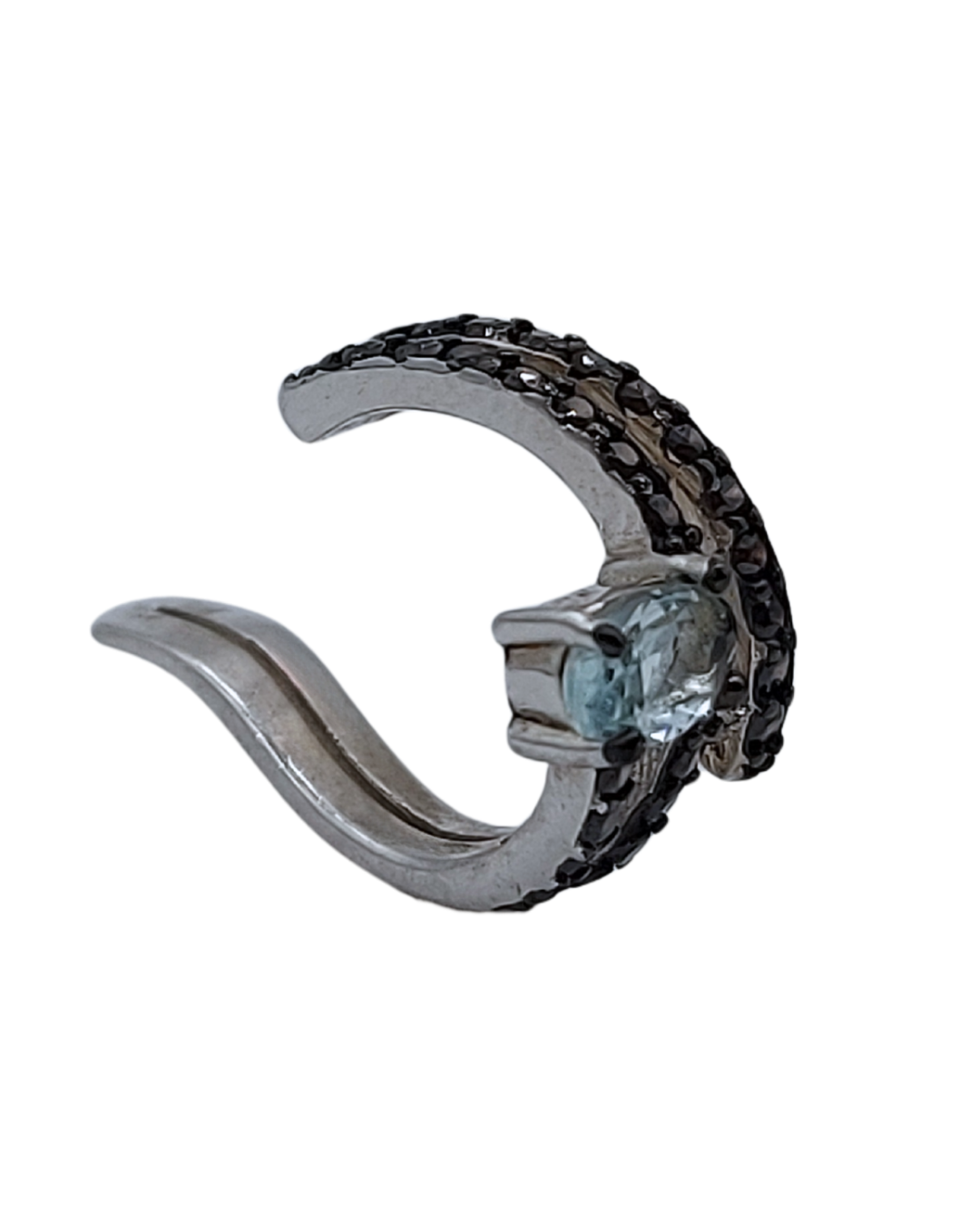 Piercing de gancho em prata com banho de ouro branco, adornado com zircônias pretas que formam um contraste elegante e uma zircônia azul central em lapidação oval, trazendo brilho e sofisticação ao design moderno.