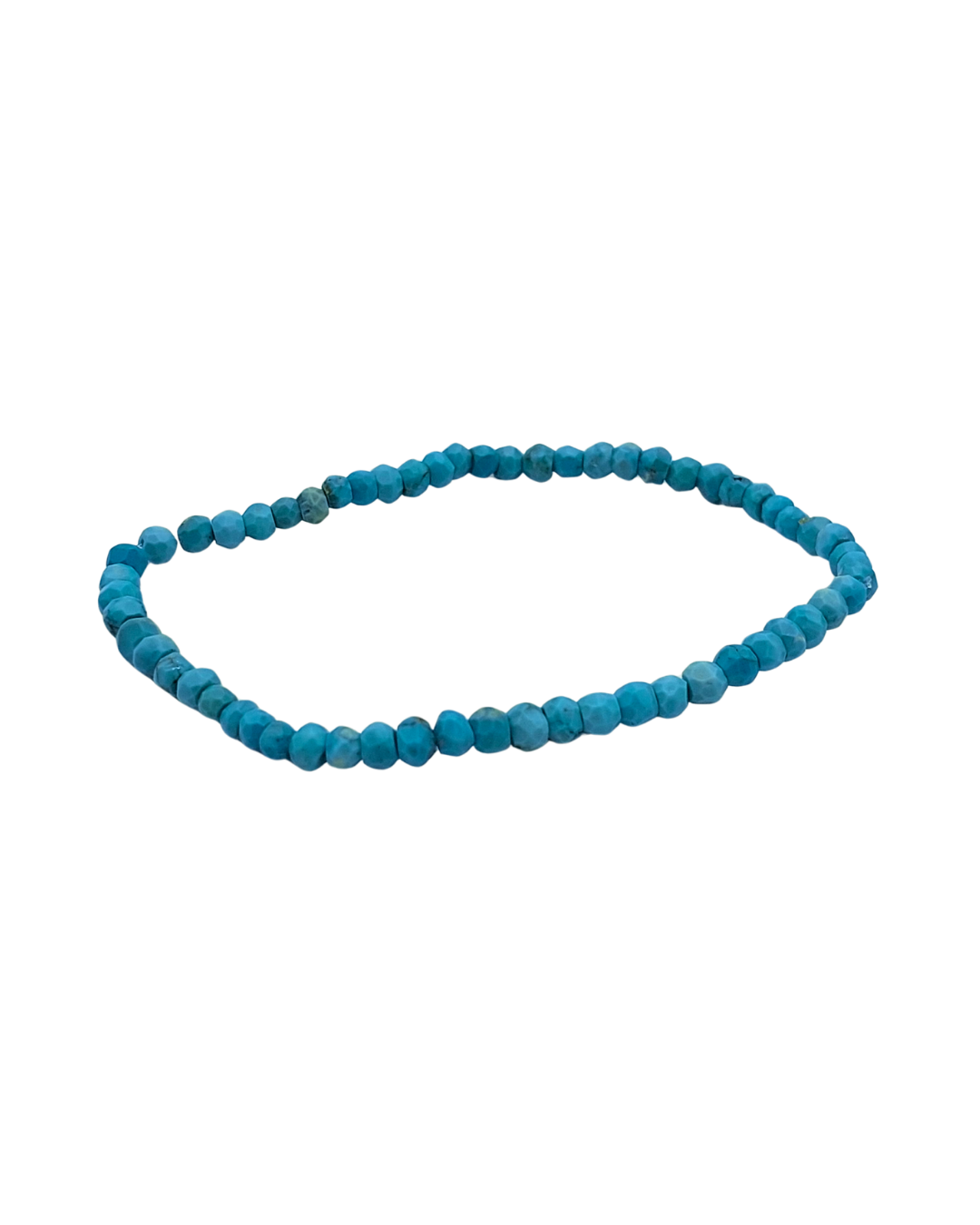 Pulseira de turquesa com pedras naturais pequenas e facetadas, que realçam o brilho e a cor azul intensa característica da pedra. Delicada e versátil, é perfeita para usar sozinha ou em composições, trazendo um toque de cor e personalidade ao look.