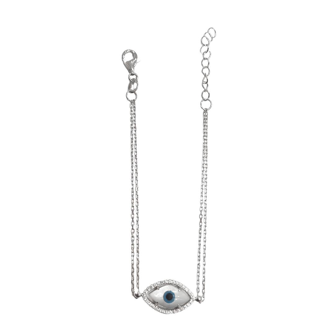 Pulseira prata e banho de ródio com olho grego madrepérola