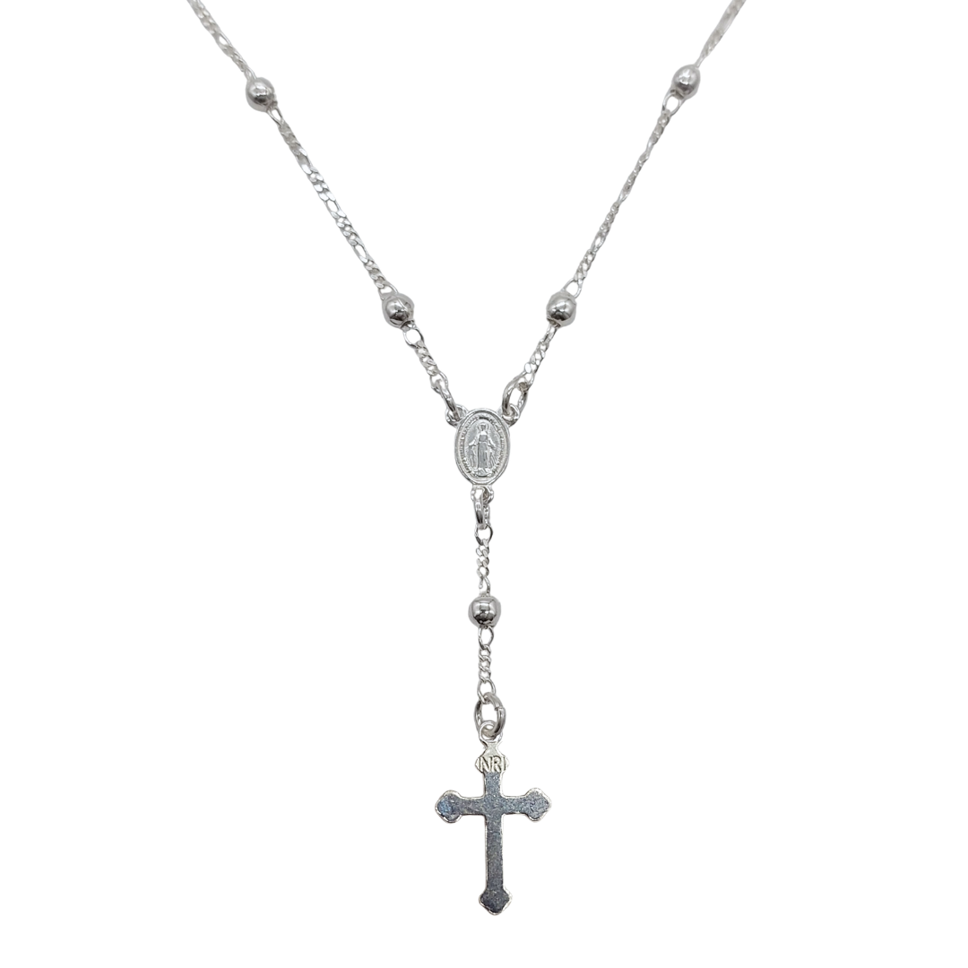 Terço em prata 925 de 58cm, com design clássico e delicado. Possui corrente com pequenas esferas, medalha central e cruz pendente, criando um visual elegante e atemporal. Uma joia significativa, perfeita para uso diário ou para presentear com intenção e estilo.